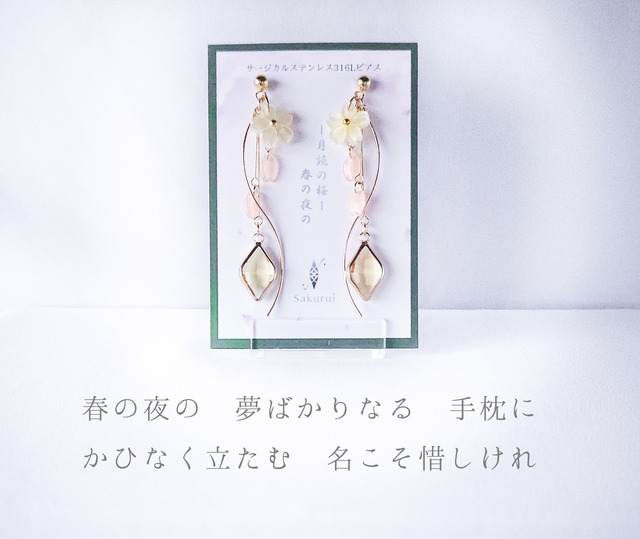 注意事項を読んでいただいてからご購入くださいますようにお願い申し上げます。 【百人一首モチーフアクセサリー】 *-月読の桜- 春の夜の* 春の夜の 夢ばかりなる 手枕(たまくら)に かひなく立たむ 名こそ惜しけれ 訳 春の夜、夢のような手枕に身を寄せているのに、無駄に立ち去ってしまうのは、 その名が惜しいことだ。 春の夜の夢のような情景と、愛する人との別れを惜しむ気持ちを表現しています。 【-月読の桜-】 百人一首モチーフは、春の近江神宮に咲き誇る桜をイメージして制作しました。 競技かるたをしていた時のことを思い出し、淡い切ない句と共に、桜を耳元で満喫できる作品に仕上げております。 *花びらなど、入荷時期により薄くなったり濃くなったりと色の変化があります。そちらも合わせてお楽しみいただけましたら幸いです。 *台紙は予告無く変更になる場合がございます。 \ new / 【ネックレス】 サイズ:50㎝ 着脱簡単マグネット式(調節不可) 色味:春の夜の(黄) 耳飾りと同じ彩りのネックレスを追加できます。 +3500円 (単品で購入するより少しお得です) 以下、オプションになります。 【ピアス】 ①サージカルステンレス316Lポストピアス ②サージカルステンレス316Lフック式ピアス ③樹脂ピアス 【イヤリング】 ④樹脂イヤリング ⑤ネジバネ式 (シリコン付き/サージカルステンレス24kgp) ⑥18kgp痛くなりにくい/落ちにくい蝶バネ式 *ギフトラッピングについて* ギフトボックスにお入れしての梱包になります。 ※オリジナルショップ袋付き (+600円) 詳しくはこちら▽ https://sakurui0817.base.shop/items/68179849 【注意事項】 *発送まで~30日ほどかかります。 *サイズは多少の誤差がある場合があります。 *細いピアノ線を使っているため絡まることがあります。1度耳飾りを振って元の位置にお戻し下さい。 *ガラスパーツになりますので、透かした際/台紙がある際/太陽光に当てた時/など、色の見え方がそれぞれ変化します。それも楽しんで頂けましたら幸いです。