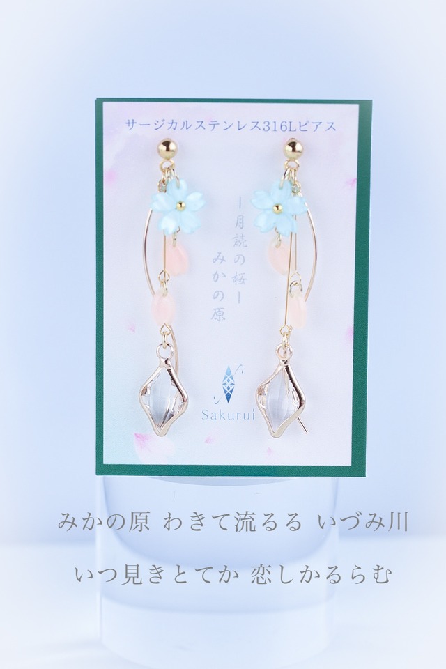 注意事項を読んでいただいてからご購入くださいますようにお願い申し上げます。 【百人一首モチーフアクセサリー】 *-月読の桜- みかの原* みかの原 わきて流るる 泉川 いつ見きとてか 恋しかるらむ 訳 みかの原から湧き出て、二分するようにして流れる泉川のように はっきり会った記憶があるわけでもないのに、 なぜだか胸が惹かれて、恋しくてたまらない。 【-月読の桜-】 百人一首モチーフは、春の近江神宮に咲き誇る桜をイメージして制作しました。 競技かるたをしていた時のことを思い出し、淡い切ない句と共に、桜を耳元で満喫できる作品に仕上げております。 *花びらなど、入荷時期により薄くなったり濃くなったりと色の変化があります。そちらも合わせてお楽しみいただけましたら幸いです。 *台紙は予告無く変更になる場合がございます。 \ new / 【ネックレス】 サイズ:50㎝ 着脱簡単マグネット式(調節不可) 色味:みかの原(クリア) 耳飾りと同じ彩りのネックレスを追加できます。 +3500円 (単品で購入するより少しお得です) 以下、オプションになります。 【ピアス】 ①サージカルステンレス316Lポストピアス ②サージカルステンレス316Lフック式ピアス ③樹脂ピアス 【イヤリング】 ④樹脂イヤリング ⑤ネジバネ式 (シリコン付き/サージカルステンレス24kgp) ⑥18kgp痛くなりにくい/落ちにくい蝶バネ式 *ギフトラッピングについて* ギフトボックスにお入れしての梱包になります。 ※オリジナルショップ袋付き (+600円) 【注意事項】 *発送まで~30日ほどかかります。 *一つ一つ心を込めて作っておりますが、ハンドメイド品ですので、完璧を求められる方は購入をお控えください。 *サイズは多少の誤差がある場合があります。 *細いピアノ線を使っているため絡まることがあります。1度耳飾りを振って元の位置にお戻し下さい。 *ガラスパーツになりますので、透かした際/台紙がある際/太陽光に当てた時/など、色の見え方がそれぞれ変化します。それも楽しんで頂けましたら幸いです。