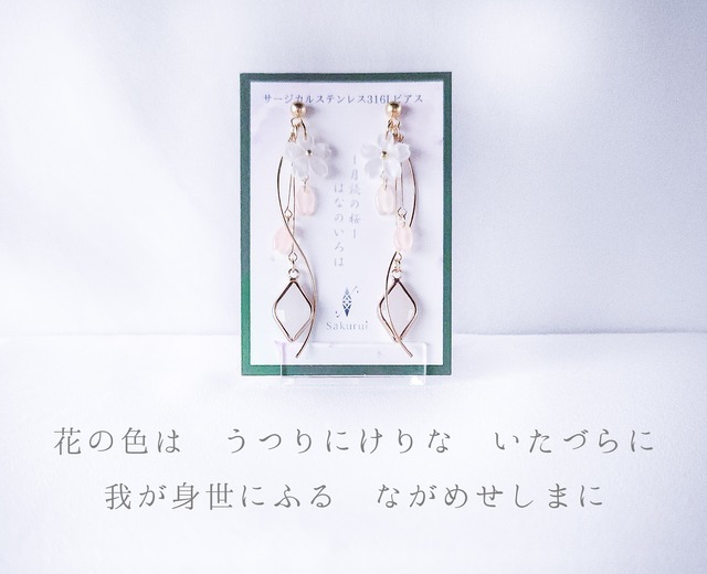 注意事項を読んでいただいてからご購入くださいますようにお願い申し上げます。 【百人一首モチーフアクセサリー】 *-月読の桜- はなさそふ* 花さそふ 嵐の庭の 雪ならで ふりゆくものは 我が身なりけり 訳 桜の花を誘って吹き散らす嵐の日の庭は、桜の花びらがまるで雪のように降っているが、実は老いさらばえて古(ふ)りゆくのは、私自身なのだなあ。 【-月読の桜-】 百人一首モチーフは、春の近江神宮に咲き誇る桜をイメージして制作しました。 競技かるたをしていた時のことを思い出し、淡い切ない句と共に、桜を耳元で満喫できる作品に仕上げております。 *花びらなど、入荷時期により薄くなったり濃くなったりと色の変化があります。そちらも合わせてお楽しみいただけましたら幸いです。 *ミルキー系は気泡が入りやすい作品です。多少の気泡はご了承ください。 *台紙は予告無く変更になる場合がございます。 *写真より少し濃い色味 \ new / 【ネックレス】 サイズ:50㎝ 着脱簡単マグネット式(調節不可) 色味:はなさそふ(ミルキーピンク) 耳飾りと同じ彩りのネックレスを追加できます。 +3500円 (単品で購入するより少しお得です) 以下、オプションになります。 【ピアス】 ①サージカルステンレス316Lポストピアス ②サージカルステンレス316Lフック式ピアス ③樹脂ピアス 【イヤリング】 ④樹脂イヤリング ⑤ネジバネ式 (シリコン付き/サージカルステンレス24kgp) ⑥18kgp痛くなりにくい/落ちにくい蝶バネ式 *ギフトラッピングについて* ギフトボックスにお入れしての梱包になります。 ※オリジナルショップ袋付き (+600円) 詳しくはこちら▽ https://sakurui0817.base.shop/items/68179849 【注意事項】 *発送まで~30日ほどかかります。 *サイズは多少の誤差がある場合があります。 *細いピアノ線を使っているため絡まることがあります。1度耳飾りを振って元の位置にお戻し下さい。 *ガラスパーツになりますので、透かした際/台紙がある際/太陽光に当てた時/など、色の見え方がそれぞれ変化します。それも楽しんで頂けましたら幸いです。