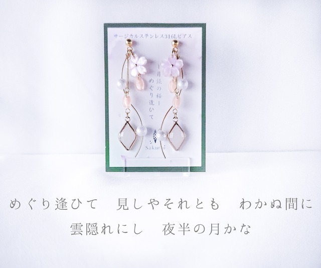 注意事項を読んでいただいてからご購入くださいますようにお願い申し上げます。 【百人一首モチーフアクセサリー】 *-月読の桜- めぐりあいて* (コットンパールビーズ付き) めぐり逢ひて 見しやそれとも わかぬ間に 雲隠れにし 夜半の月かな 訳 せっかく久しぶりに逢えたのに、それが貴女だと分かるかどうかのわずかな間にあわただしく帰ってしまわれた。まるで雲間にさっと隠れてしまう夜半の月のように。 【-月読の桜-】 百人一首モチーフは、春の近江神宮に咲き誇る桜をイメージして制作しました。 競技かるたをしていた時のことを思い出し、淡い切ない句と共に、桜を耳元で満喫できる作品に仕上げております。 *花びらなど、入荷時期により薄くなったり濃くなったりと色の変化があります。そちらも合わせてお楽しみいただけましたら幸いです。 *ミルキーカラーのひし形は元々白い筋や気泡が入りやすい作品です。予めご了承ください。 *台紙は予告無く変更になる場合がございます。 \ new / 【ネックレス】 サイズ:50㎝ 着脱簡単マグネット式(調節不可) 色味:めぐり逢ひて(白) 耳飾りと同じ彩りのネックレスを追加できます。 +3500円 (単品で購入するより少しお得です) 以下、オプションになります。 【ピアス】 ①サージカルステンレス316Lポストピアス ②サージカルステンレス316Lフック式ピアス ③樹脂ピアス 【イヤリング】 ④樹脂イヤリング ⑤ネジバネ式 (シリコン付き/サージカルステンレス24kgp) ⑥18kgp痛くなりにくい/落ちにくい蝶バネ式 *ギフトラッピングについて* ギフトボックスにお入れしての梱包になります。 ※オリジナルショップ袋付き (+600円) 詳しくはこちら▽ https://sakurui0817.base.shop/items/68179849 【注意事項】 *発送まで~30日ほどかかります。 *サイズは多少の誤差がある場合があります。 *細いピアノ線を使っているため絡まることがあります。1度耳飾りを振って元の位置にお戻し下さい。 *ガラスパーツになりますので、透かした際/台紙がある際/太陽光に当てた時/など、色の見え方がそれぞれ変化します。それも楽しんで頂けましたら幸いです。