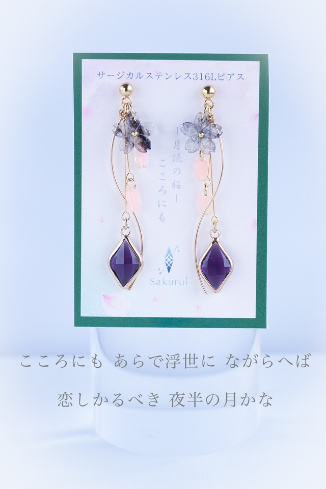 注意事項を読んでいただいてからご購入くださいますようにお願い申し上げます。 【百人一首モチーフアクセサリー】 *-月読の桜- こころにも* 心にも あらでうき世に ながらへば 恋しかるべき 夜半の月かな 訳 この夜更けの月が心ならずも、このはかない現世で生きながらえていたならば、 きっと恋しく思い出されるに違いない 【-月読の桜-】 百人一首モチーフは、春の近江神宮に咲き誇る桜をイメージして制作しました。 競技かるたをしていた時のことを思い出し、淡い切ない句と共に、桜を耳元で満喫できる作品に仕上げております。 *花びらなど、入荷時期により薄くなったり濃くなったりと色の変化があります。そちらも合わせてお楽しみいただけましたら幸いです。 *台紙は予告無く変更になる場合がございます。 \ new / 【ネックレス】 サイズ:50㎝ 着脱簡単マグネット式(調節不可) 色味:こころにも(パープル) 耳飾りと同じ彩りのネックレスを追加できます。 +3500円 (単品で購入するより少しお得です) 以下、オプションになります。 【ピアス】 ①サージカルステンレス316Lポストピアス ②サージカルステンレス316Lフック式ピアス ③樹脂ピアス 【イヤリング】 ④樹脂イヤリング ⑤ネジバネ式 (シリコン付き/サージカルステンレス24kgp) ⑥18kgp痛くなりにくい/落ちにくい蝶バネ式 *ギフトラッピングについて* ギフトボックスにお入れしての梱包になります。 ※オリジナルショップ袋付き (+600円) 【注意事項】 *発送まで~30日ほどかかります。 *一つ一つ心を込めて作っておりますが、ハンドメイド品ですので、完璧を求められる方は購入をお控えください。 *サイズは多少の誤差がある場合があります。 *細いピアノ線を使っているため絡まることがあります。1度耳飾りを振って元の位置にお戻し下さい。 *ガラスパーツになりますので、透かした際/台紙がある際/太陽光に当てた時/など、色の見え方がそれぞれ変化します。それも楽しんで頂けましたら幸いです。