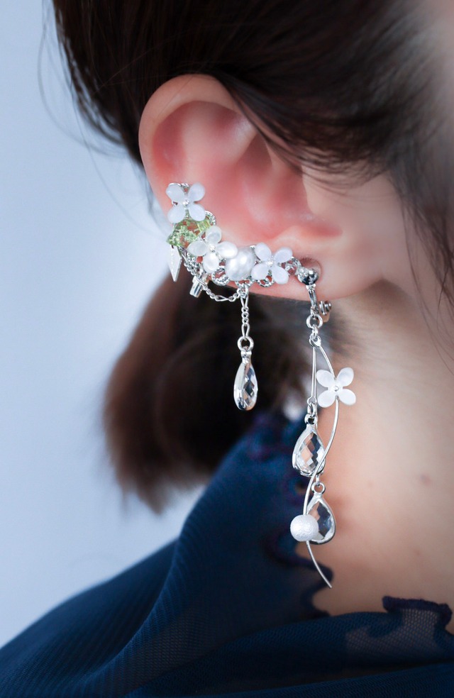 注意事項を読んでいただいてからご購入くださいますようにお願い申し上げます。 -----* 雪月花×銀木犀 *----- イヤカフは右耳専用です。 「月が零す香に、雪が花ひらく夜。」 アシンメトリーの彩りは、 片耳だけにつけても 両耳で合わせても美しく飾れる 唯一無二のアクセサリー 雫のお色 【クリア】 をご用意しています。 アシンメトリーなので、 片耳につけても、両耳につけても、バラバラにつけてもオシャレ。 シャンデリアのような神秘的な美しい輝きを、銀木犀と共に表現致しました。 多方面カットガラスがゆらゆら揺れて上品に、どんなシーンでもおしゃれにつけて頂けます。 光の反射でキラキラと綺麗に艷めく様をお楽しみください。 色味▽ シルバー 金具 サージカルステンレス316Lピアス 痛くなりにくい落ちにくいイヤリング 【注意事項】 *発送までは〜30日ほど頂きます。 ご了承ください。 *一つ一つ心を込めて作っておりますが、ハンドメイド品ですので、完璧を求められる方は購入をお控えください。 *サイズは多少の誤差がある場合があります。 *金具を固定させるため、接着剤+レジンコーティングをしております。 レジン:KIYOHARA レジンアレルギーの方はご購入をお控えください。 *ガラスパーツになりますので、透かした際/台紙がある際/太陽光に当てた時/など、色の見え方がそれぞれ変化します。それも楽しんで頂けましたら幸いです。
