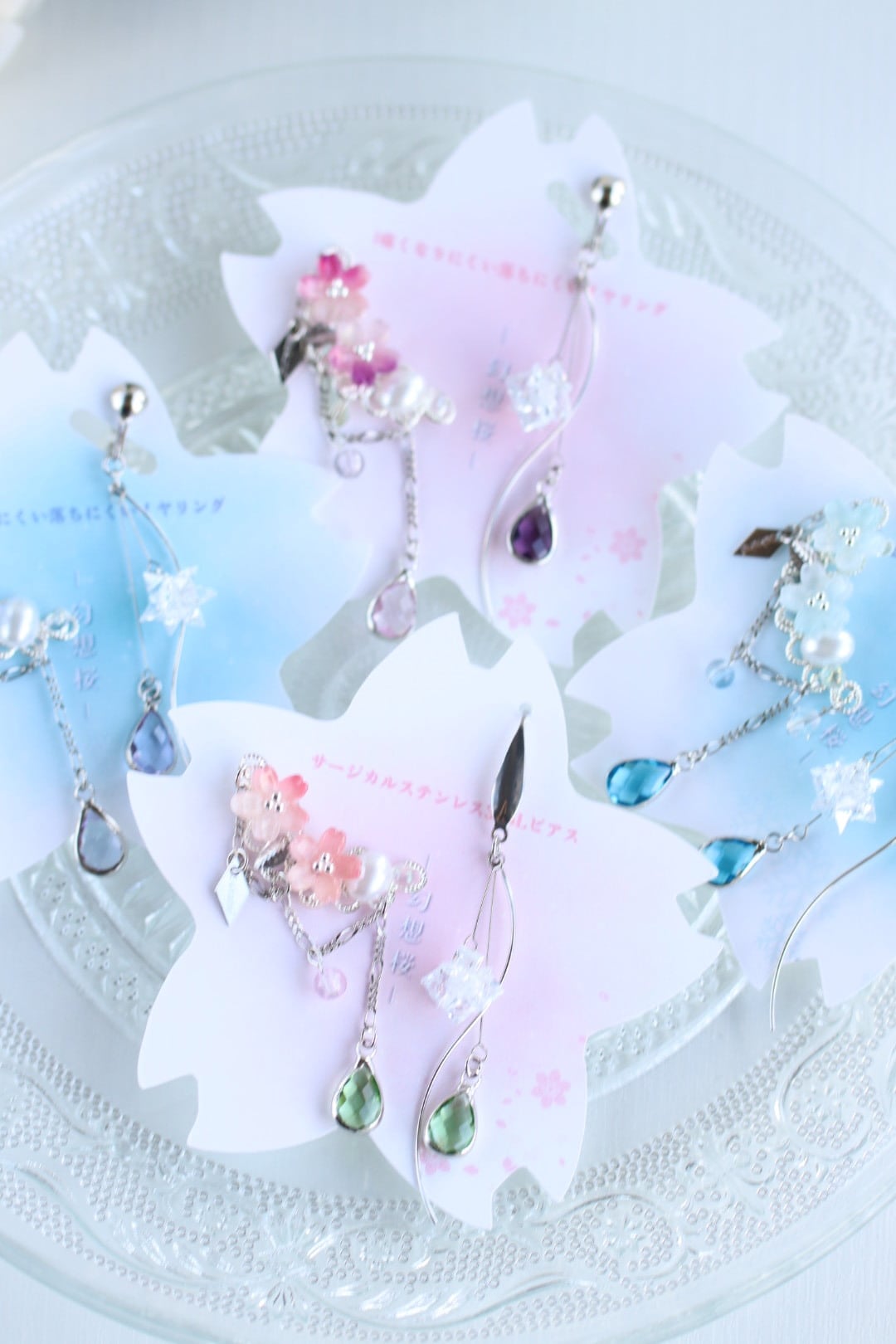 *ガラスパーツになりますので、透かした際/台紙がある際/太陽光に当てた時/など、色の見え方がそれぞれ変化します。それも楽しんで頂けましたら幸いです。