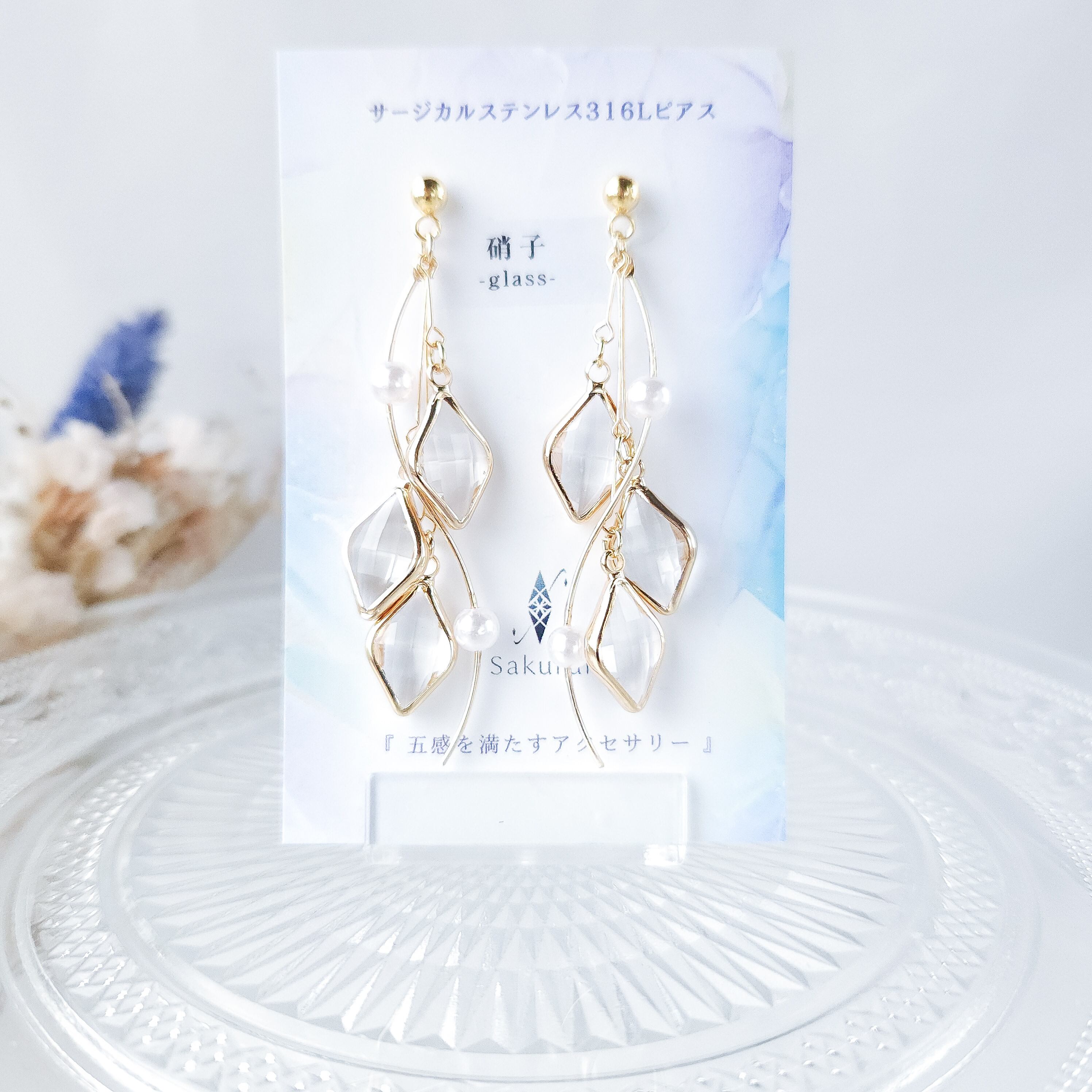 *ガラスパーツになりますので、透かした際/台紙がある際/太陽光に当てた時/など、色の見え方がそれぞれ変化します。それも楽しんで頂けましたら幸いです。