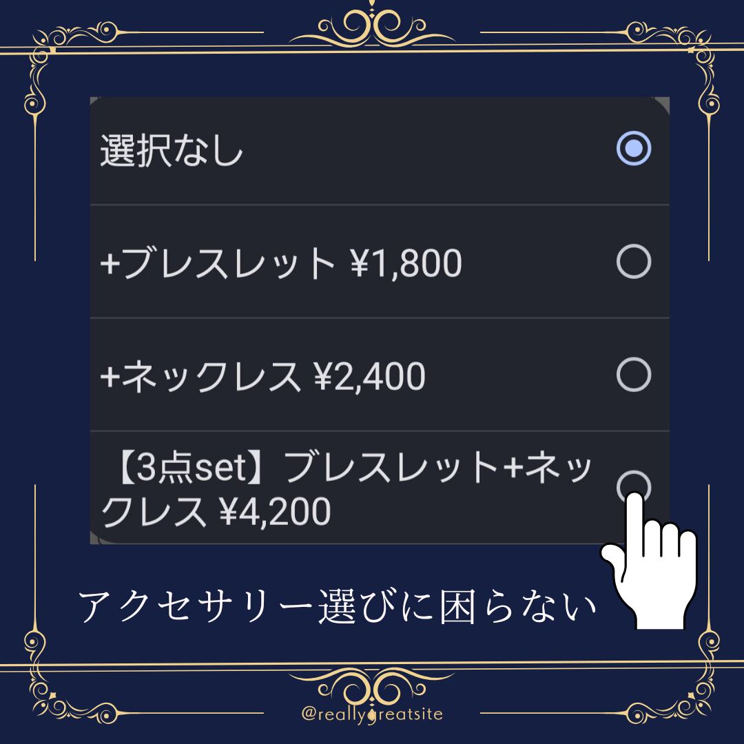 ブレスレット/ネックレス/リングセット希望の方はオプションにて追加し、ご購入ください。